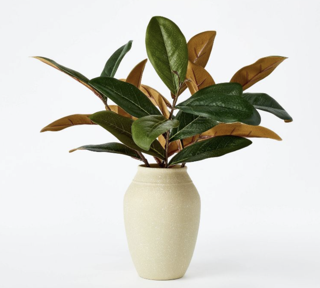 Thirdly, this small magnolia leaf potted plant is simple yet sophisticated making it perfect for accenting your fireplace mantel.