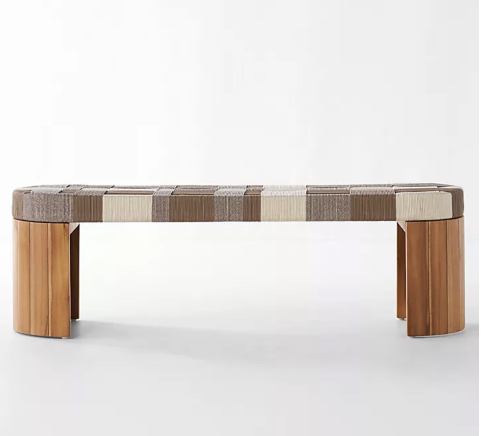 Next up is this mid century modern outdoor bench from Anthropologie. This piece is versatile for both indoor and outdoor use and it features a teak wood bench with a woven nylon rope seat reinforced with aluminum, resulting in slight variations in natural wood texture.