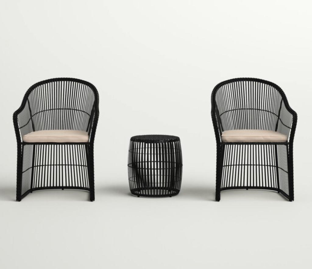 This mid century modern outdoor bistro set is great if you have a small space that you want to make stylish and functional. This 3-piece conversation set offers a cozy outdoor seating area with two armchairs and an end table, all featuring a durable steel frame wrapped in UV-, water-, and weather-resistant resin wicker. The armchairs feature a mid-century-inspired sled base and comfortable seat cushions, while the barrel-shaped end table provides a convenient spot for snacks or drinks.