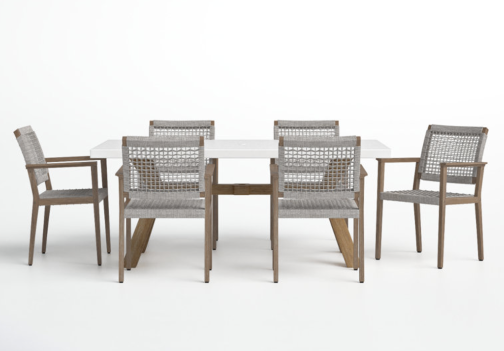 Thirdly, we have this stunning mid century modern outdoor dining set. This 7-piece dining set features a sustainable, plantation-grown eucalyptus hardwood table with an ivory composite top made of molded polyresin and powdered concrete for durability, complemented by handwoven nautical-grade rope chairs. This set might just be the world’s prettiest outdoor dining set, I am obsessed!