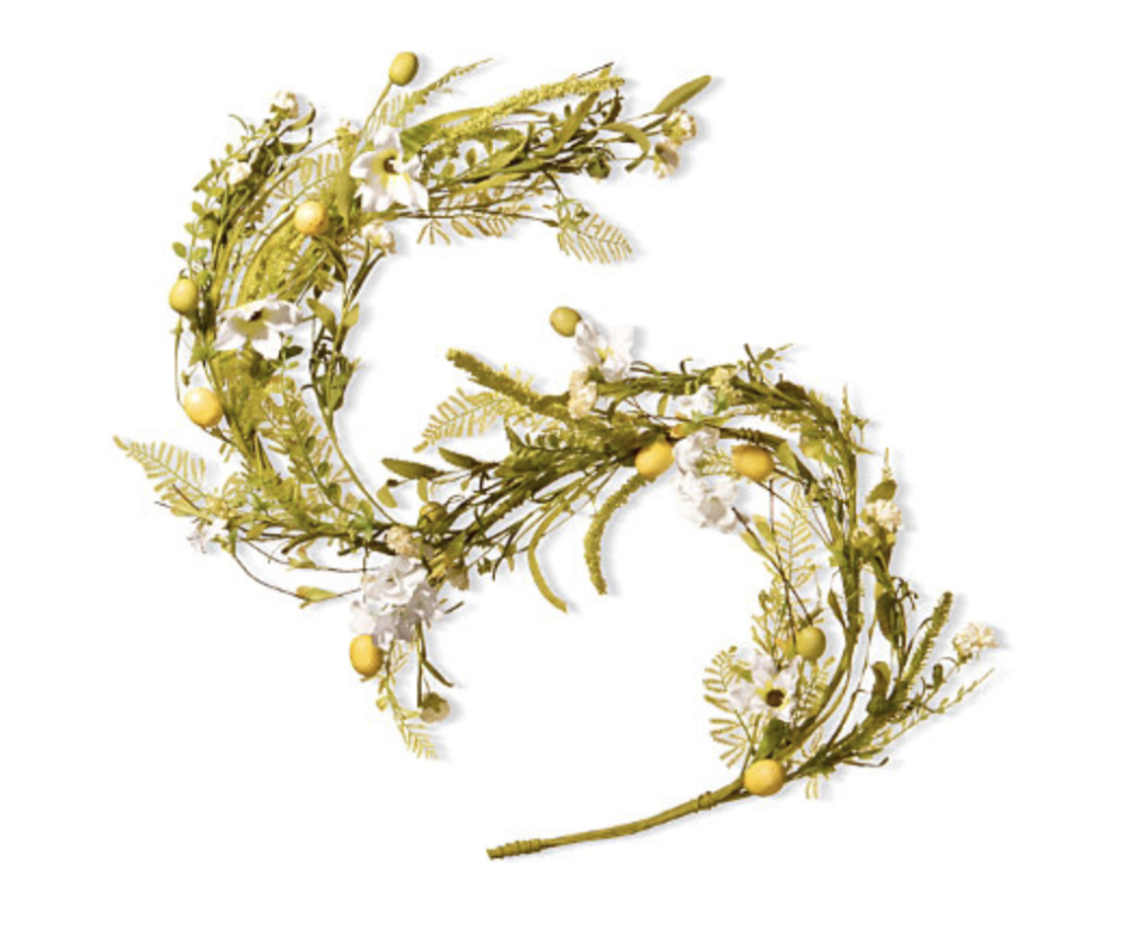 Next up, we have this simple spring and easter flower garland from Ashley Homestore. Garland is perfect for adding some greenery and life to a space. You could display this garland over doors, windows, fireplace mantels, fences, or stairway railings, in indoor or covered outdoor locations.