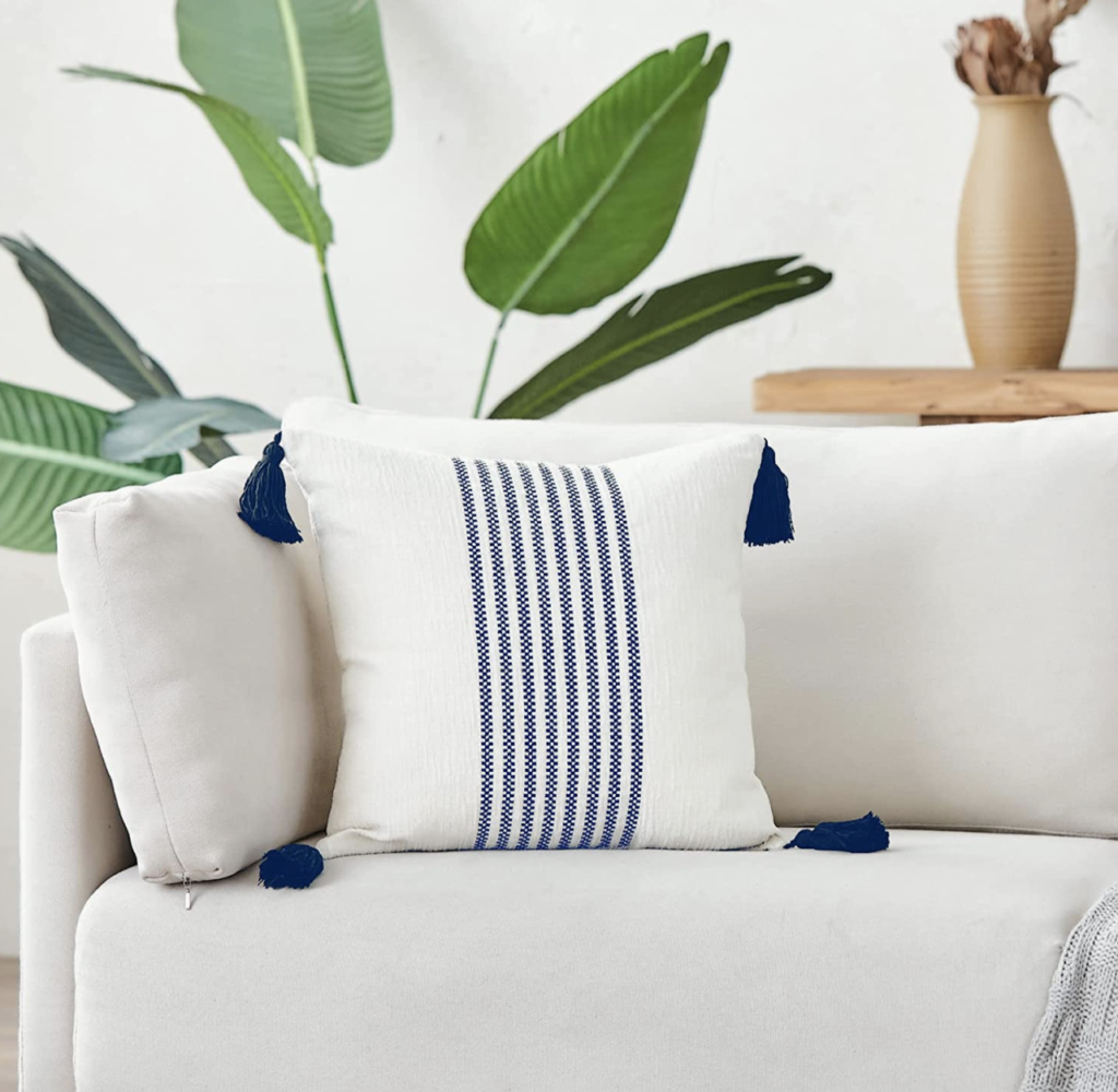 Additionally, we have some more pillows. After all, pillows are an inexpensive way to add some texture and color into a space. I love these navy blue embroidery striped throw pillows. These are sophisticated and elegant looking.