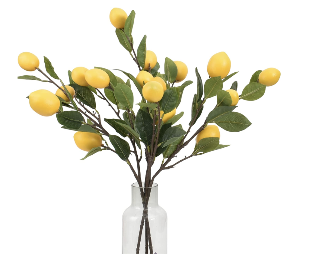 Thirdly, we have this stunning summer counter decor look. I don’t know about you, but I am obsessed with this look. To begin, this large ceramic ginger jar is stunning. Moreover, these lemon branches from Amazon go perfectly, just add some fresh hydrangeas to complete the look. Additionally, these faux lemons from Target have high-star reviews and an affordable price. If you like Nantucket basket weave-style bowls, this stacking bowl is perfect. Lastly, to finish off the look is this beautiful tray from Amazon.