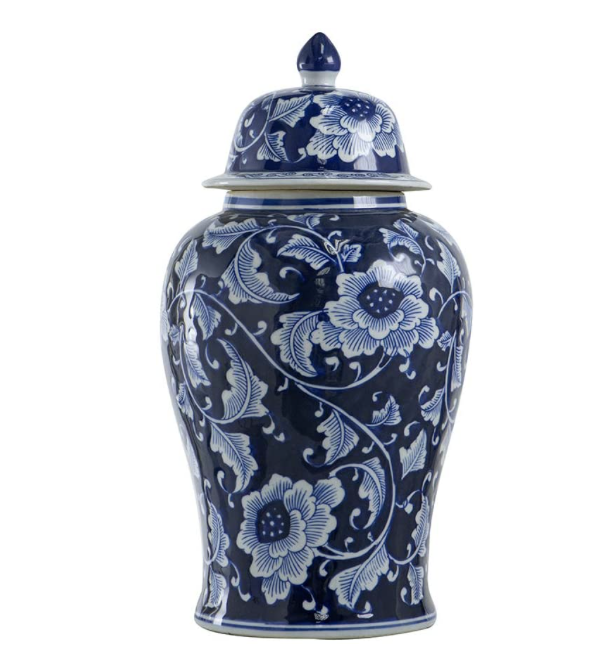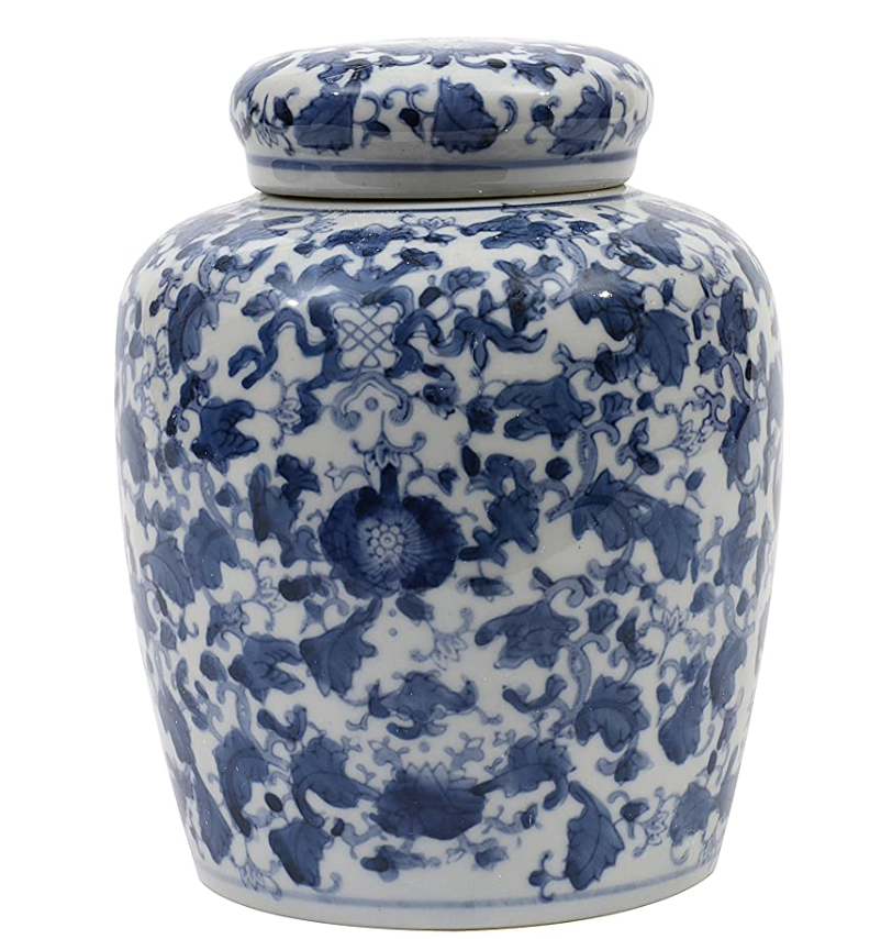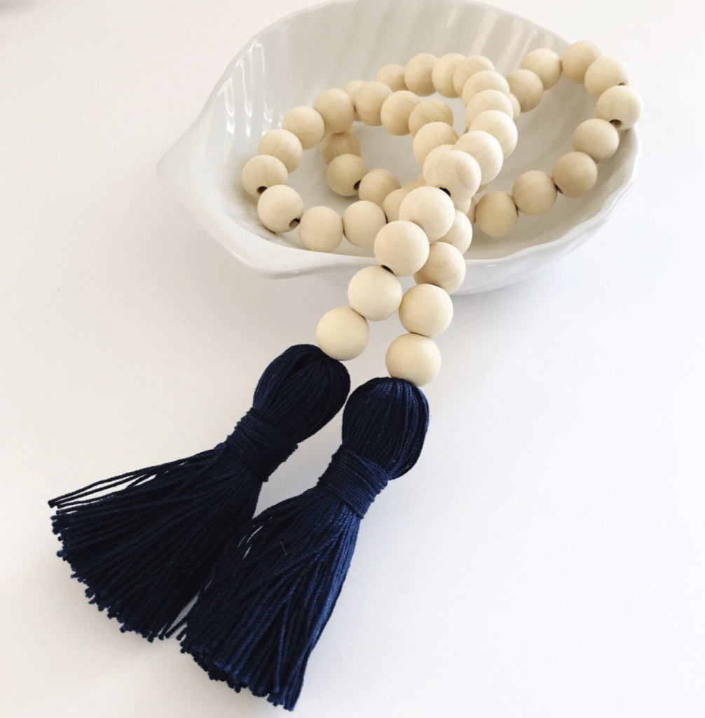 Finally, we have this gold and navy kitchen decor look. To start, this gold and marble tray can be purchased at World Market. Also, the blue and white ginger jar is quite the show stopper. When it comes to styling the jar, you can use real or fake flowers, it’s your preference. Although, fake flowers never die which is a great thing. So if you’re looking for a good white fake flower option these from Crate and Barrel have good reviews. Finally, I love these decorative wood beads, especially with the navy tassels. In short, it’s safe to say I’m obsessed with this look.