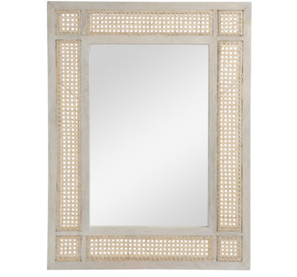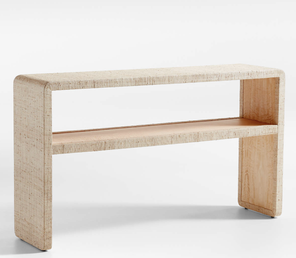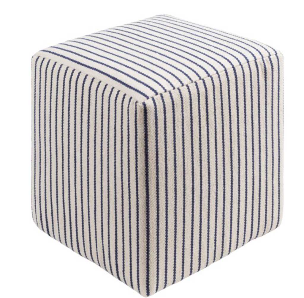Secondly, we have this much more serene and neutral entryway look. Firstly, this gorgeous Meadow Grasscloth Console Table from Crate & Barrel is a dupe for a much more expensive table from Serena & Lily. Next, these navy striped accent poufs are perfect for this look. Another essential piece to this look is this natural-colored Mirror with Wicker Caning from Walmart. Also, don’t forget to check out the other pieces I linked below!