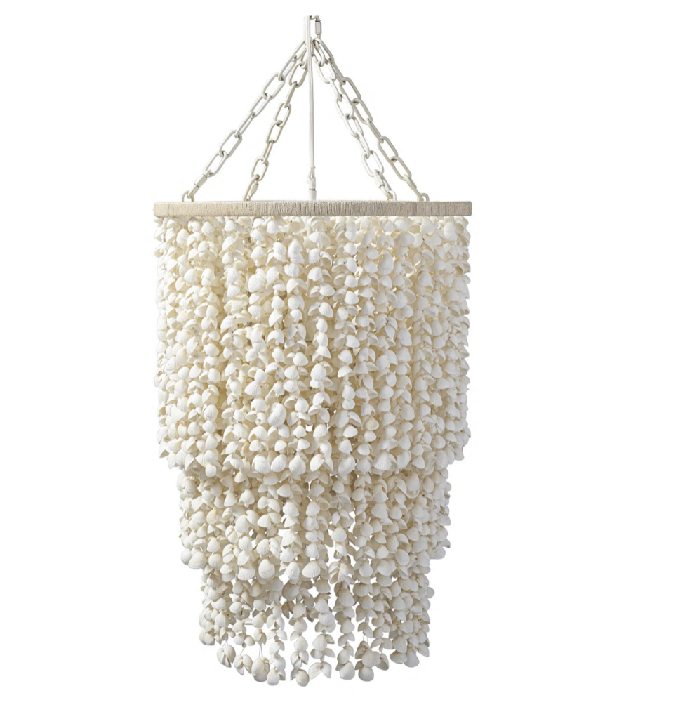 Next, the Aptos Shell Chandelier from Serena & Lily is a unique and beautiful lighting fixture that showcases hand-harvested natural shells strung by hand. This shell chandelier is absolutely stunning and I would to have this in my home, but again $2,000 is a lot to spend. Nonetheless, I found a similar option from Etsy. This Mila Seashell Cascade Chandelier from Etsy is nearly identical but is a lot less money.