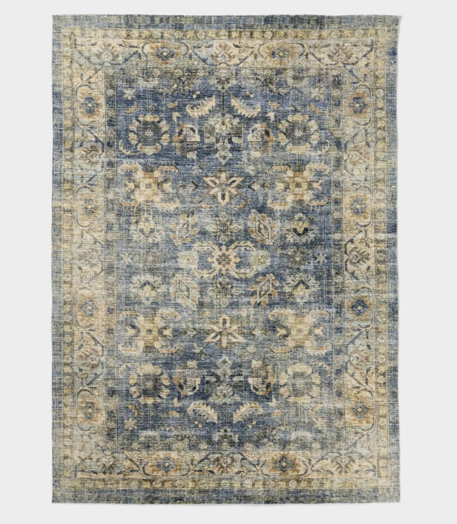 Secondly, we have this navy Persian Printed Paisley Style Rug from Studio Mcgee at Target. This is a soft lightweight rectangular area rug, with an all-over Persian printed paisley pattern and its tasseled edges add an extra touch of elegance. With a low pile height, cleaning becomes so much easier, making it perfect for busy spaces like your den or entryway. Also, it’s designed with a cotton backing, ensuring it stays securely in place.