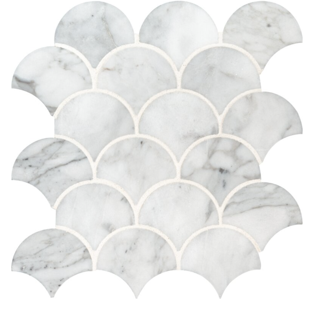 Finally carrara marble is a timeless choice, offering a refined simplicity with its white background and subtle gray and blue veins. The mini arabesque pattern in Carrara white marble adds a touch of sophistication to any space, while the classic lantern shape provides a timeless appeal. These elegant marble tiles will elevate the look of any room.