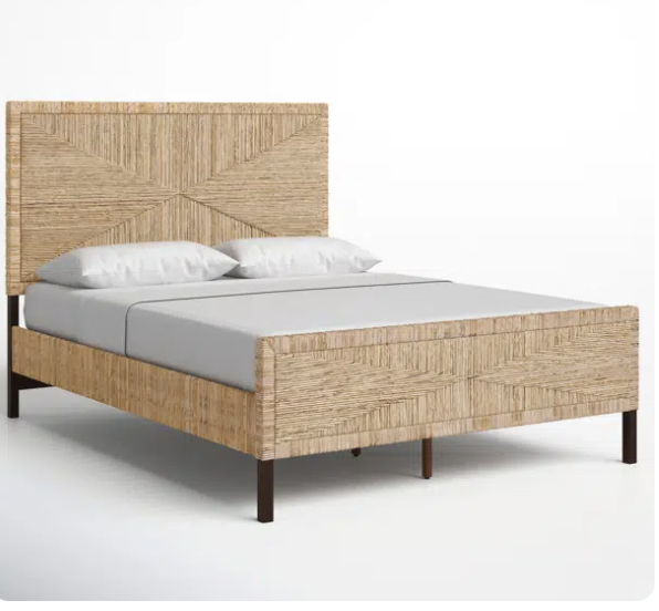 Finally, we have this coastal-inspired bedroom. One of my favorite features is that bed frame which can be purchased from Wayfair. Additionally, I love this coconut shell chandelier from World Market. Also, these nightstands are so pretty and contrast perfectly with the bedframe and chandelier. In short, this bedroom is modern and coastal.