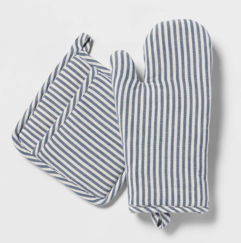 Firstly, we have this iconic-looking striped oven mitt and pot holder set.