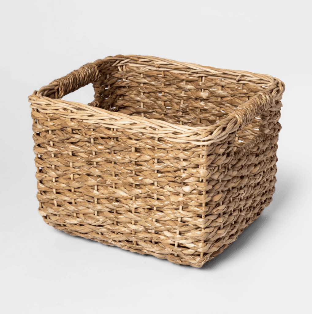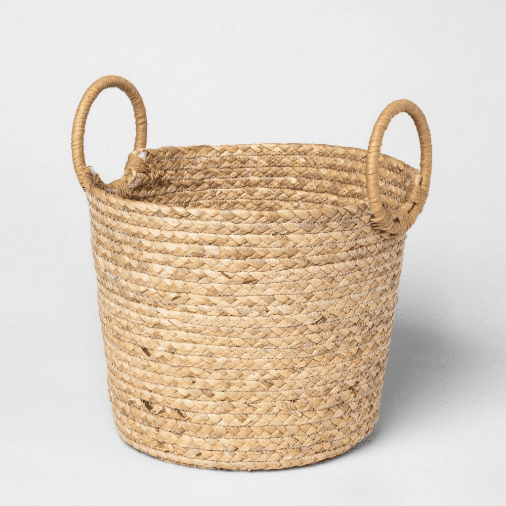 Firstly, this basket is a great piece because of its versatility because you could store so many different things here. For instance, you could store some blankets here. Additionally, these baskets are only $10, which is a great price!