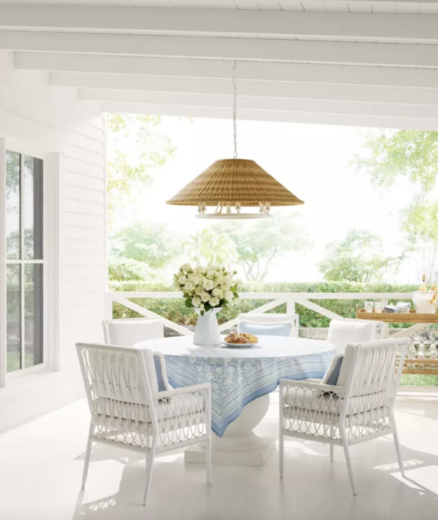 Secondly, we have this splurge-worthy watermill outdoor chandelier from Serena & Lily. If you want a high-end luxury coastal feel, then this chandelier will be a perfect option for you. This chandelier is crafted with light dune all-weather wicker on a white powder-coated frame.