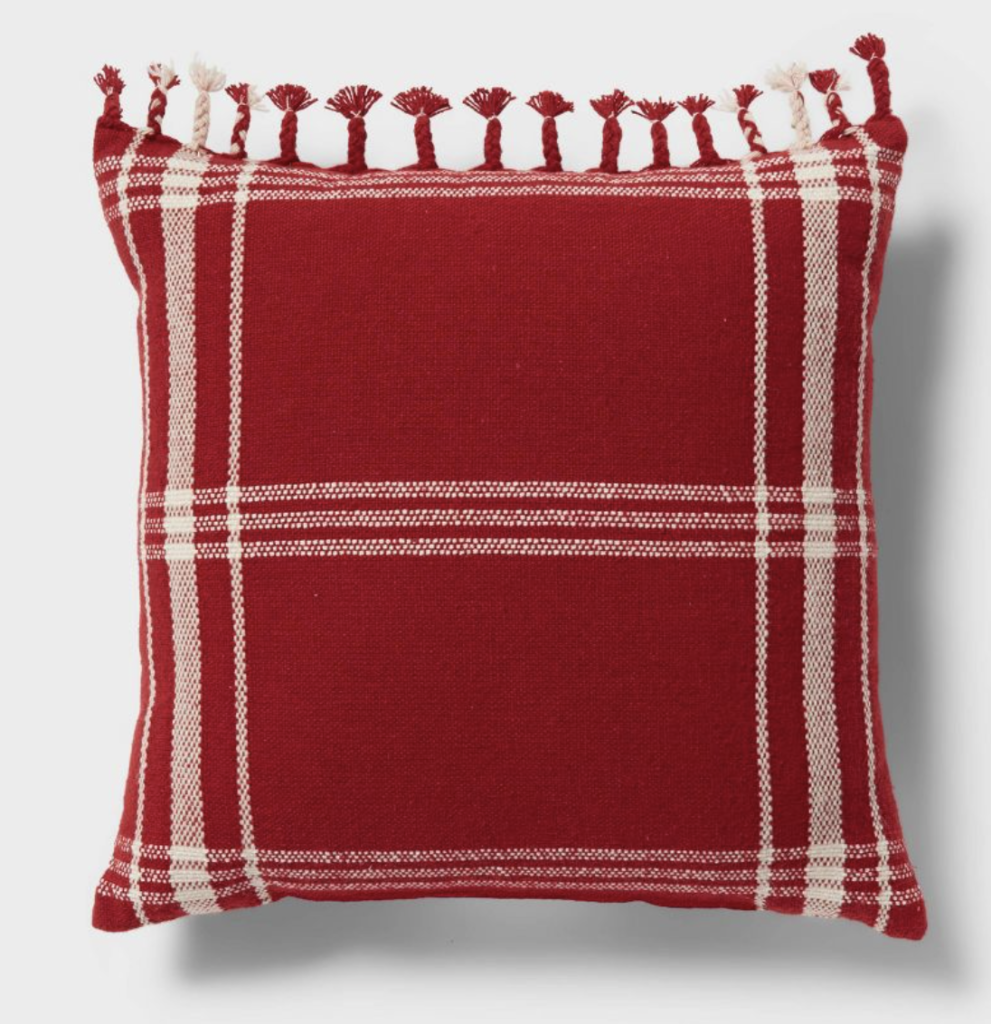 Thirdly, we have this cozy throw pillow combination. You can easily enhance your indoor seating using the Threshold™ Traditional Fringe Square Deco Pillow, featuring a festive red and cream traditional plaid pattern on the cover and tassel fringes for added decorative texture and flair. And to tone down the red, I love this ivory-colored Traditional Tufted Tree Square Deco Pillow. To complete this cozy pillow combination is this Threshold™ Traditional Cozy Up Oblong Deco Pillow, a lumbar throw pillow adorned with festive green border stitching in a green tufted finish on the cream cotton cover base.