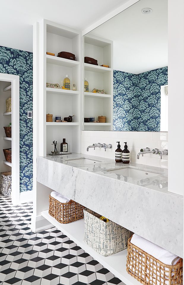Firstly, this stunning design by Katie Martinez Design is amazing! It’s safe to say that I am obsessed! I love everything about this bathroom design from the tile floors to the faucets. Not to mention this bathroom design is all functional, the hidden wall of built-in shelves is genius! In case you want to recreate this look, I linked a few similar pieces below.