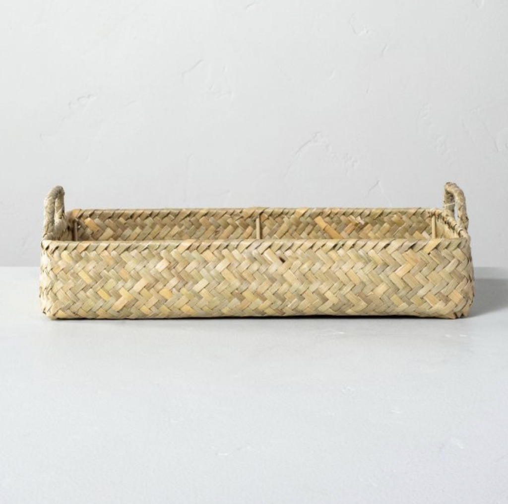 Here we go again, another beautiful coastal dining room look that I am completely obsessing over. I don’t know about you, but I am obsessed of course. Firstly, this White high gloss lacquer table with a metal base comes from Wayfair. Secondly, to go along with the table, these sun-washed riviera dining chairs from Serena and Lily, are a must. Additionally, to complete this coastal dining room table look, you’ll need a gorgeous hanging chandelier. Check out this metal chandelier with draped beads. Lastly, as part of a centerpiece on the table, check out this natural woven seagrass tray.