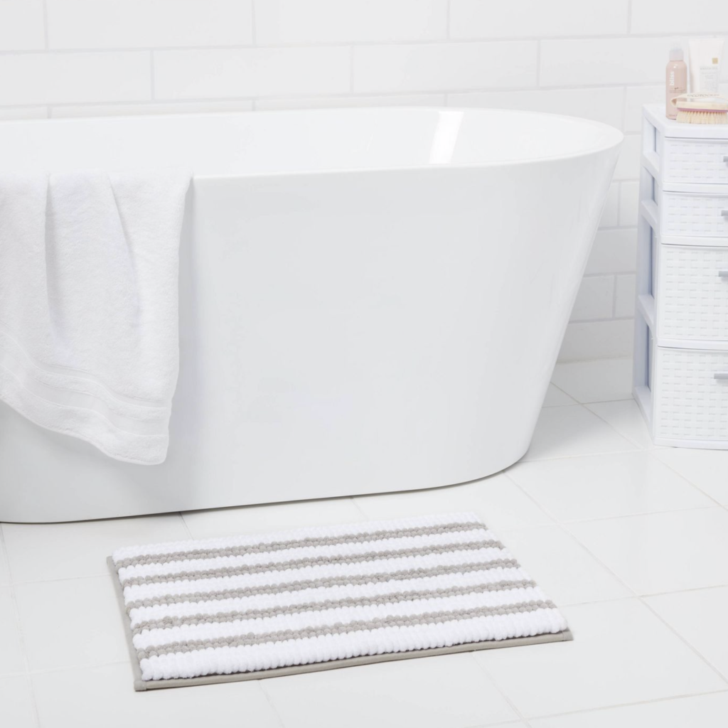 Secondly, this Chunky Chenille Striped memory foam bath rug from Room Essentials™ is all about comfort. I love the simple striped design, especially the gray and white. Also, it comes in pink and white striped and navy and white striped.