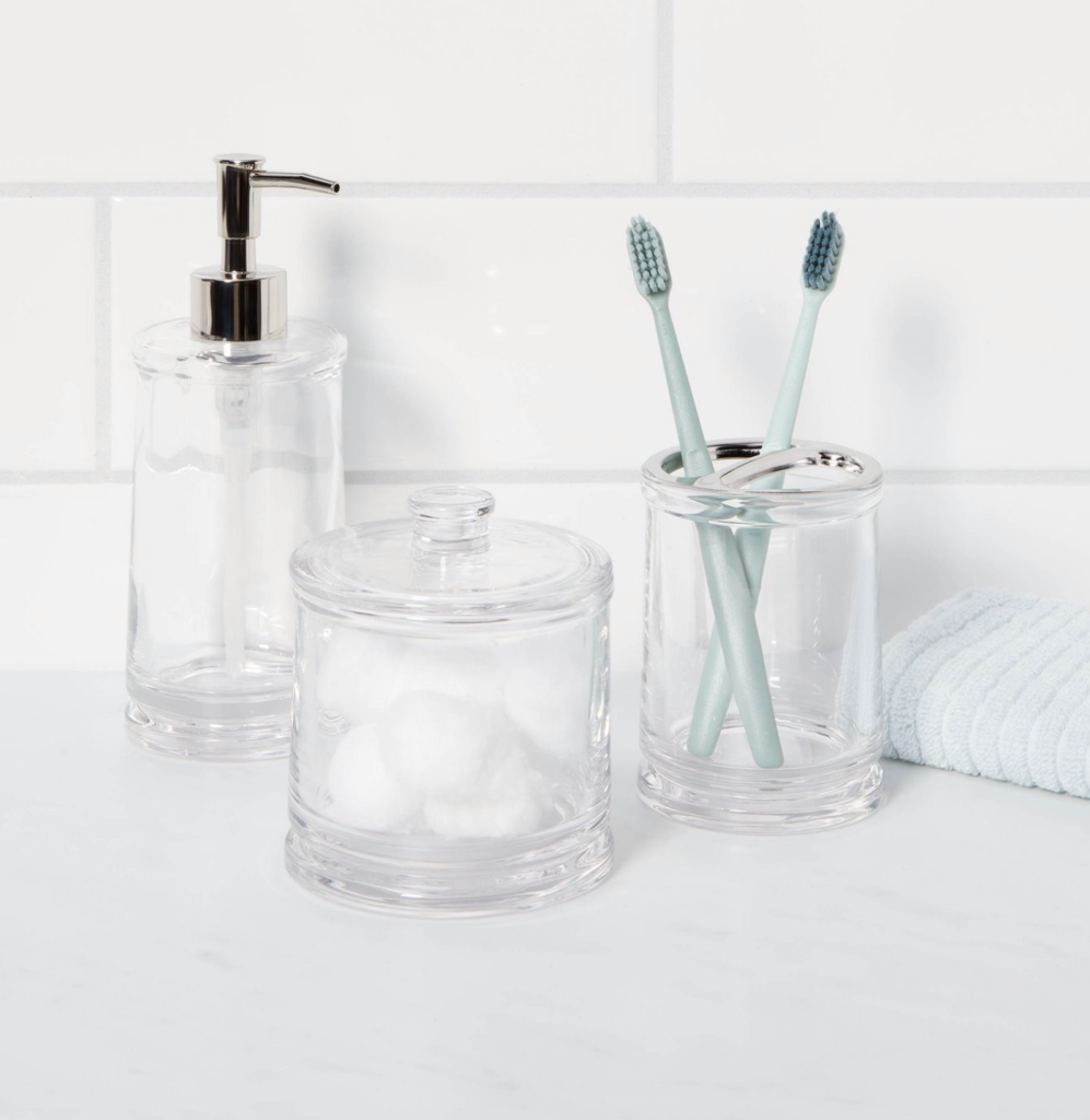 Lastly, in this soap dispenser section is this glass set from Threshold™. The glass gives a contemporary feel and would match any exciting bathroom decor.