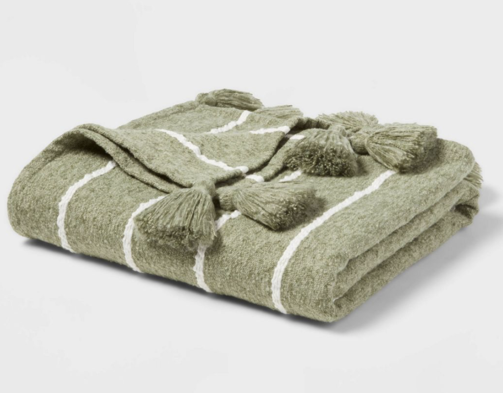 Sage green is in this fall and I am loving it. With that being said, this striped green tasseled boucle bed throw is my new favorite. Indulge in the cozy warmth and comfort of this woven boucle midweight throw blanket. The matching tassel accents not only provide a casual texture but also add a touch of decorative flair to elevate your space. Whether casually tossed on your bed or artfully draped over your couch, this blanket offers both extra warmth and a stylish accent to enhance your home decor.