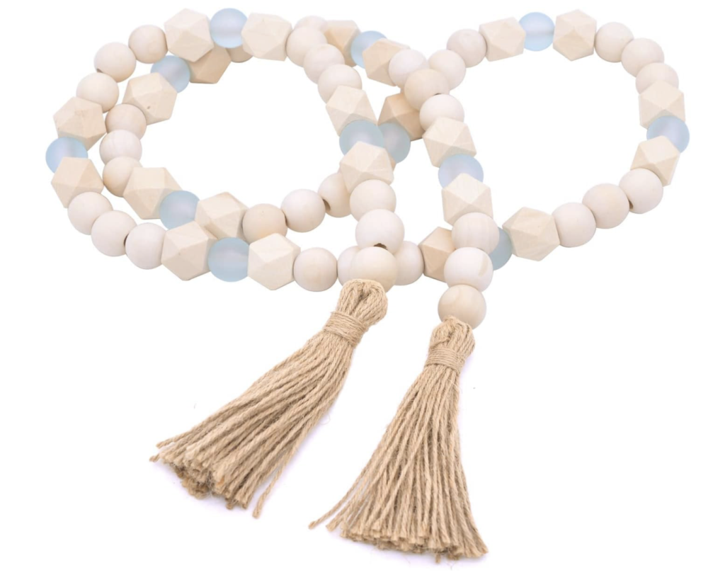 Lastly, to complete this coffee table decor look, I found this blue and natural wood bead garland that I think is perfect for this look. I would style this garland in the seashell bowl.