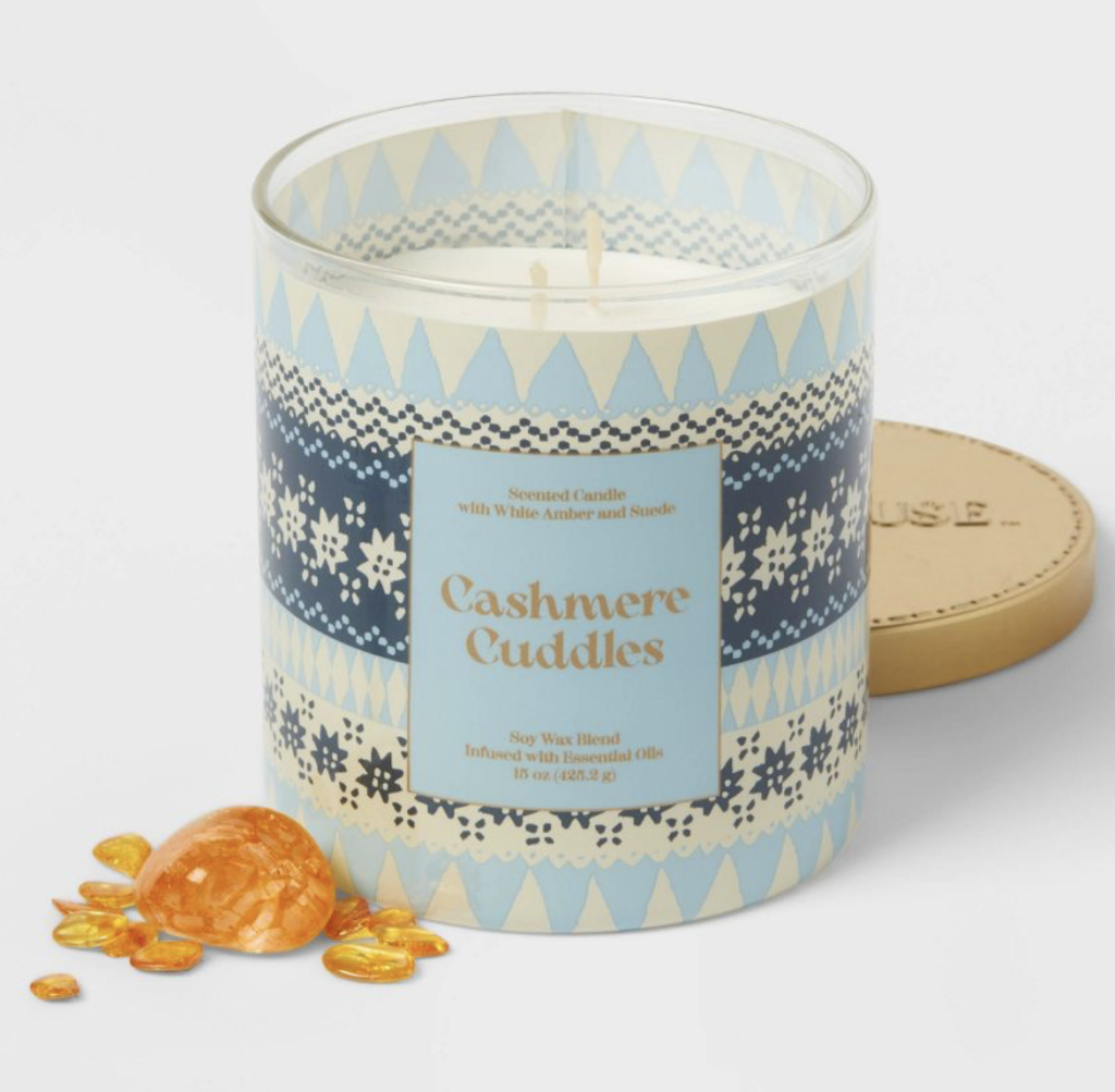 Moving along we have this pretty patterned candle. This candle has a lovely aroma of amber and suede, and it’s presented in a blue glass jar with a sweater-like-looking design, adding a cozy touch to your decor.