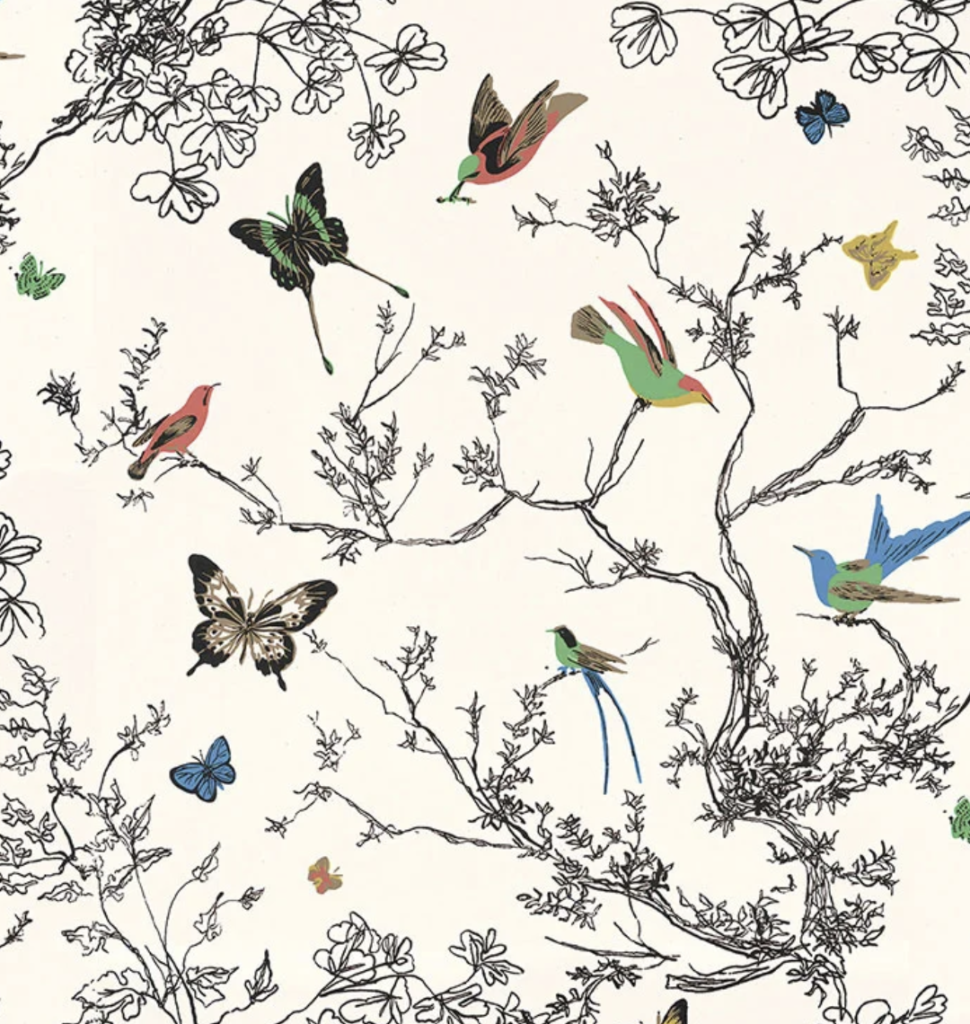 Additionally, I have to say, this transitional bathroom design is absolutely gorgeous, and the wallpaper really brings the whole space together perfectly. This playful butterfly and bird wallpaper is just fantastic. Its vibrant colors and fun patterns add a delightful touch to the room, making it even more appealing.