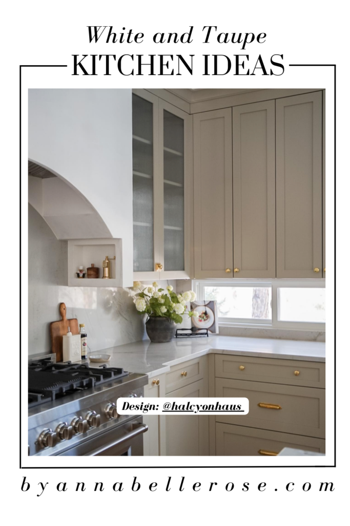 Moreover, this is a more transitional taupe kitchen cabinet look that we are nonetheless, loving. The quartzite with this taupe color is absolutely gorgeous, what a killer combination! Everything about this kitchen is amazing, we love it all, especially the arched hood range.