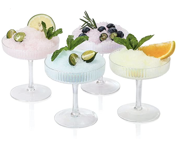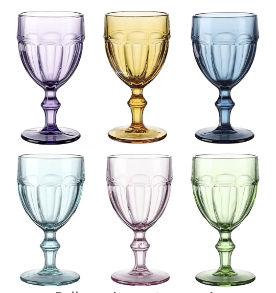 Lastly, let’s talk about Amazon’s glassware. Amazon has so many options that it came be really overwhelming. So, I put together a small list of the best unique glassware designs that will please everyone. First off, I am obsessed with these ribbed and gold-rimmed glasses! I think they are so pretty. Also, these Colored Glass Goblets are a total dupe for Anthropologie’s Louise Wine Glasses, but you’ll save some money. Finally, I have to mention these Iridescent Summit Coupe Glasses that are so fun and gorgeous. As you can see, Amazon is another great place to shop for unique drinking glassware designs.