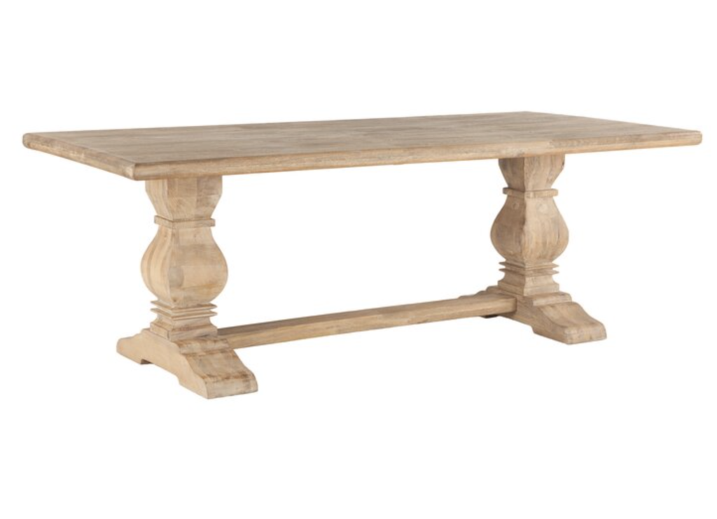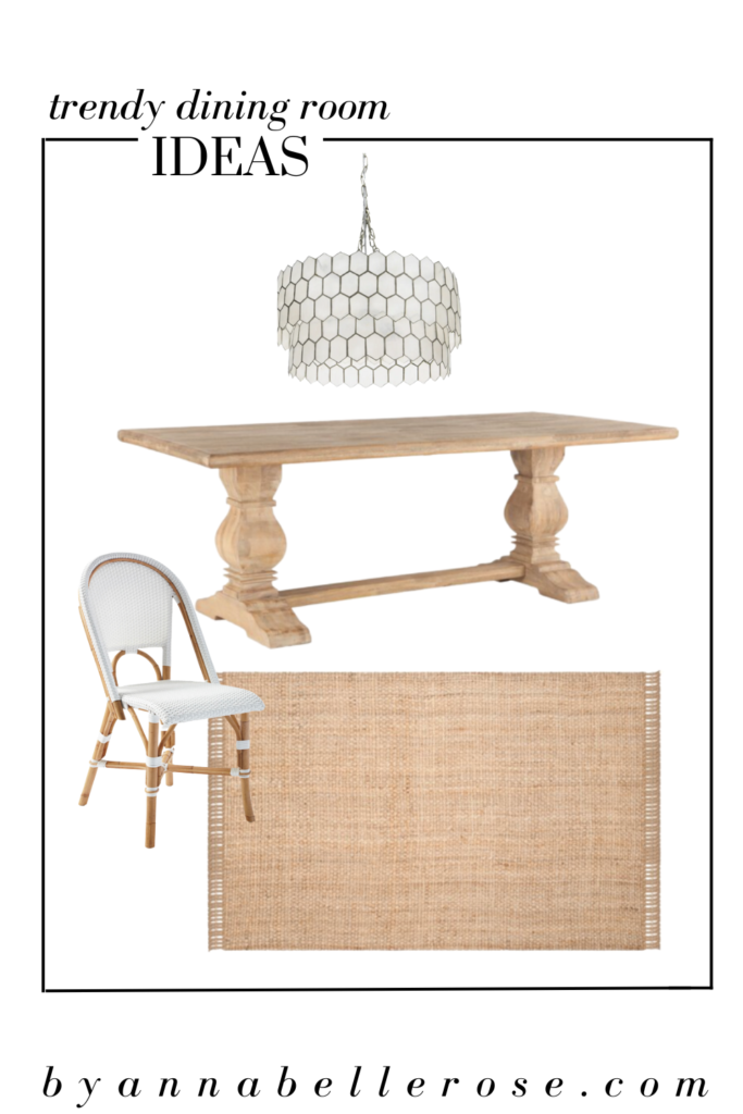 Last but not least I am obsessed with this beach house dining room look. In order to re-create this look, I have linked a couple of main elements below. Firstly, this stunning Petrey Mango Solid Wood Trestle Dining Table from Wayfair is perfect. In addition, these Riviera Dining Chairs from Serena & Lily are a perfect match. Next, this Natural Fiber Doncho Braided Jute Area Rug is a dupe for a much more expensive Serena & Lily rug. Finally, this Light Capiz Drum Chandelier from Wayfair pulls everything together.